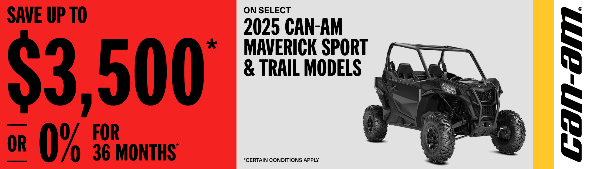 Rebate of up to $3,500 or 0% for 36 months on select 2025 Can-Am Maverick Trail & Sport models