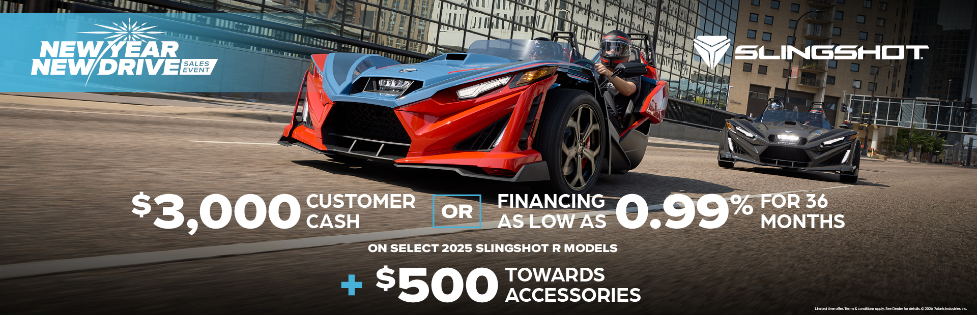*$3,000 Customer Cash 2025 Model Year R Slingshots This is a limited time offer which consists of $3,000 Customer Cash rebate towards the purchase of new model year 2025 R Slingshot. This offer is subject to change and may be extended or terminated without further notice. Offer may not be combined with promotional financing on Slingshot R models. All rebates paid to dealer and are not redeemable for cash. The $3,000 customer cash offer is specific to 2025 Slingshot R models. Offer Valid: January 1 – 31, 2026.