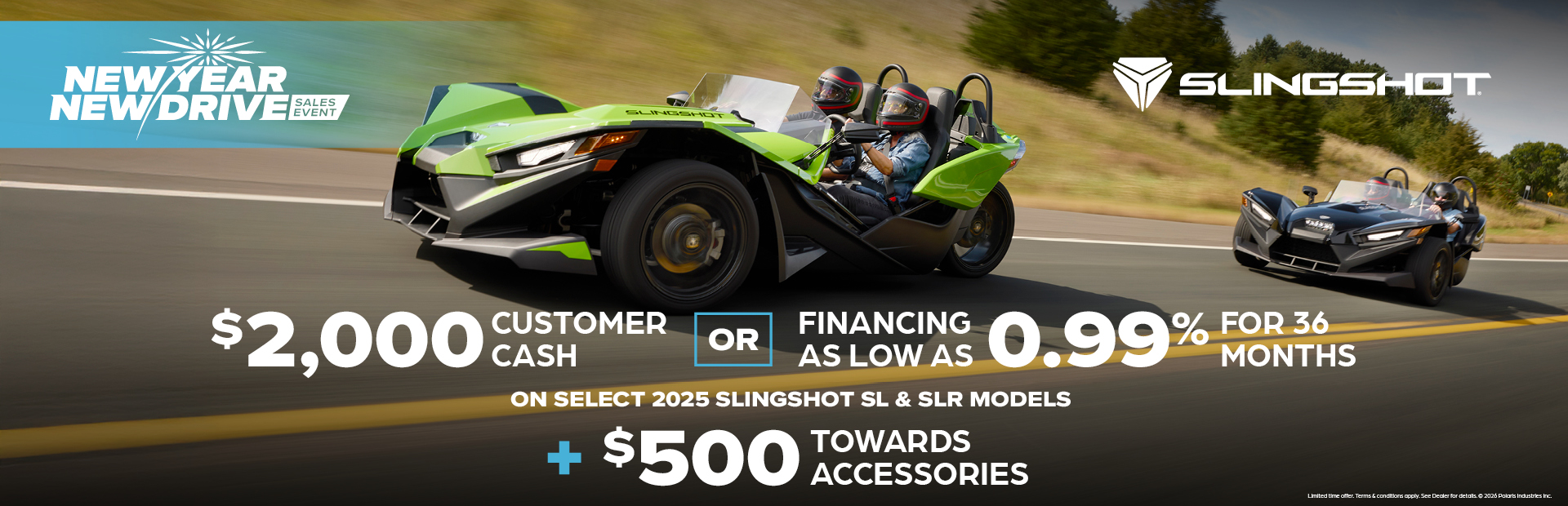 *$2,000 Customer Cash 2025 Model Year SL and SLR Slingshots This is a limited time offer which consists of $2,000 Customer Cash rebate towards the purchase of new model year 2025 SL and SLR Slingshots. This offer is subject to change and may be extended or terminated without further notice. Offer may not be combined with promotional financing on Slingshot SL or SLR models. All rebates paid to dealer and are not redeemable for cash. The $2,000 customer cash offer is specific to 2025 Slingshot SL or SLR models. Offer Valid: January 1 – 31, 2026.